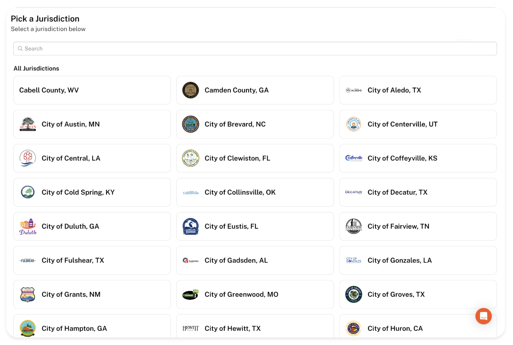 A simple view of all the locations GovWell works with - clicking on each respective location card takes you to the respective GovWell portal!