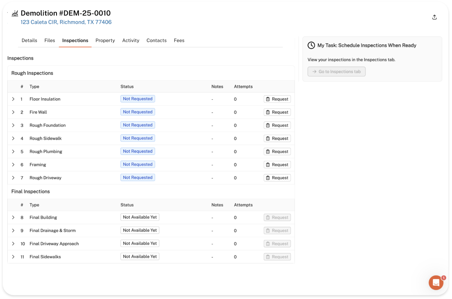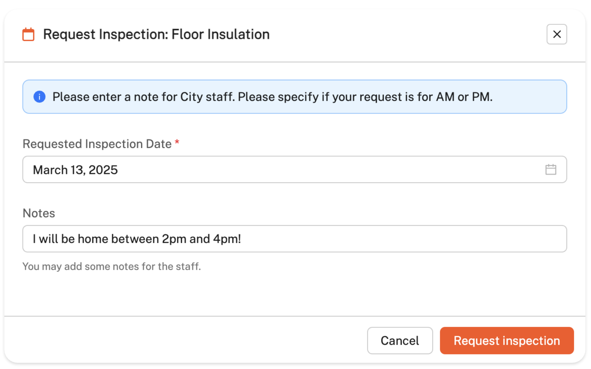 Request an inspection: You can use the 'Request' button to suggest a date and time for an inspection. Please note that this is not the same as scheduling an inspection (in some cases, scheduling may be possible — see our Requesting vs Scheduling an Inspection article for more details). Inspectors will review your request and either confirm the suggested date or propose an alternative available date.