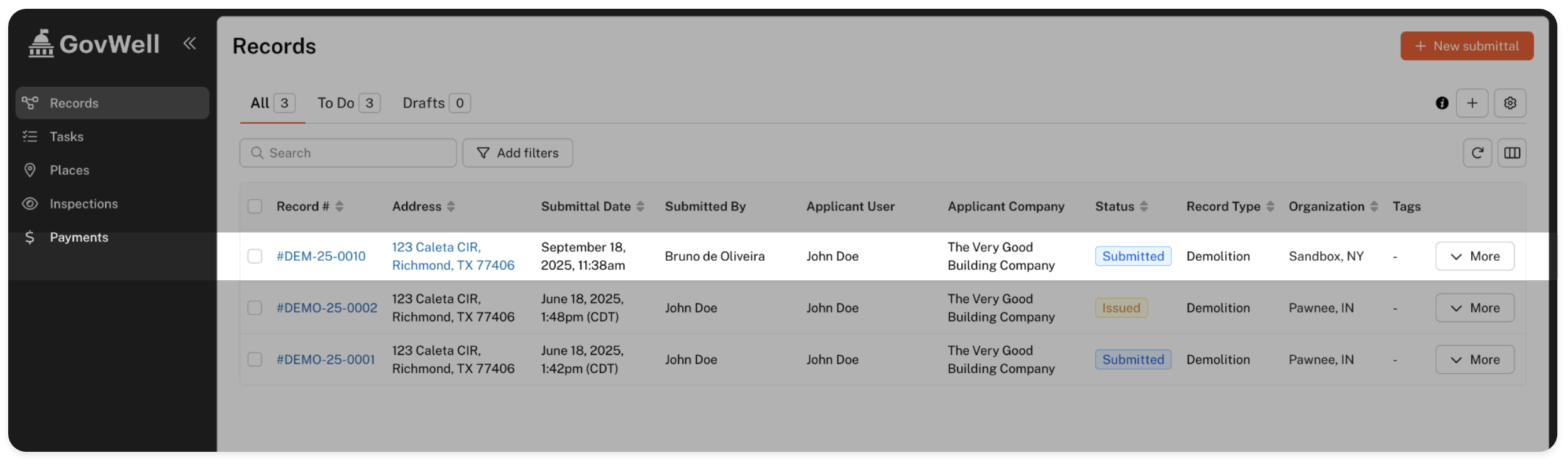 From your Records page, locate the application you want to manage. In this case, let’s see what’s happening with #DEM-25-0010 in our Sandbox environment.