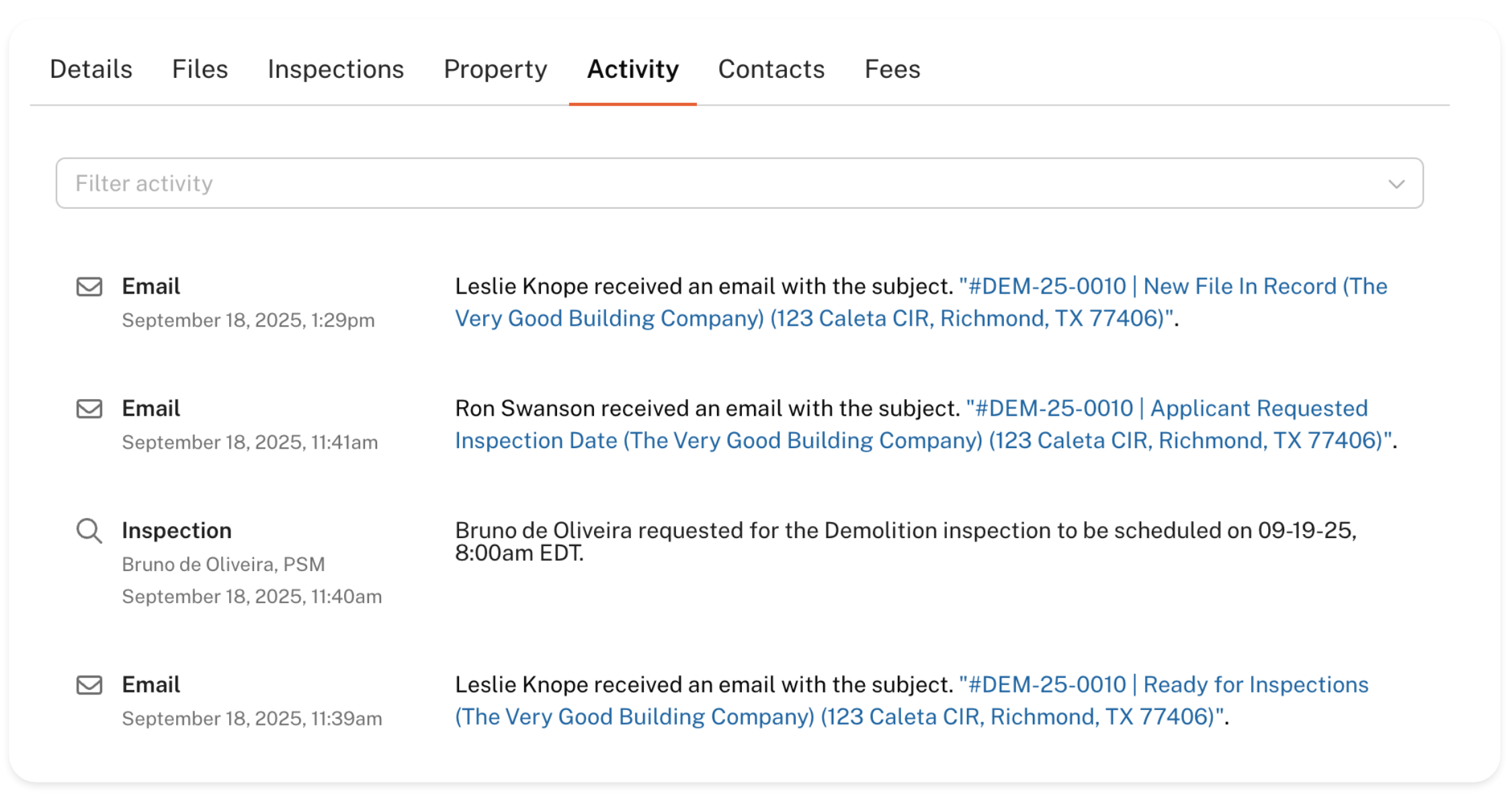This page is very useful to keep track of the timeline of events on your application! You can use the Activity tab to understand where your application is currently at. For further assistance and clarification on the activity, such as ongoing plan reviews, please contact the relevant department through the information outlined on their respective GovWell portal.