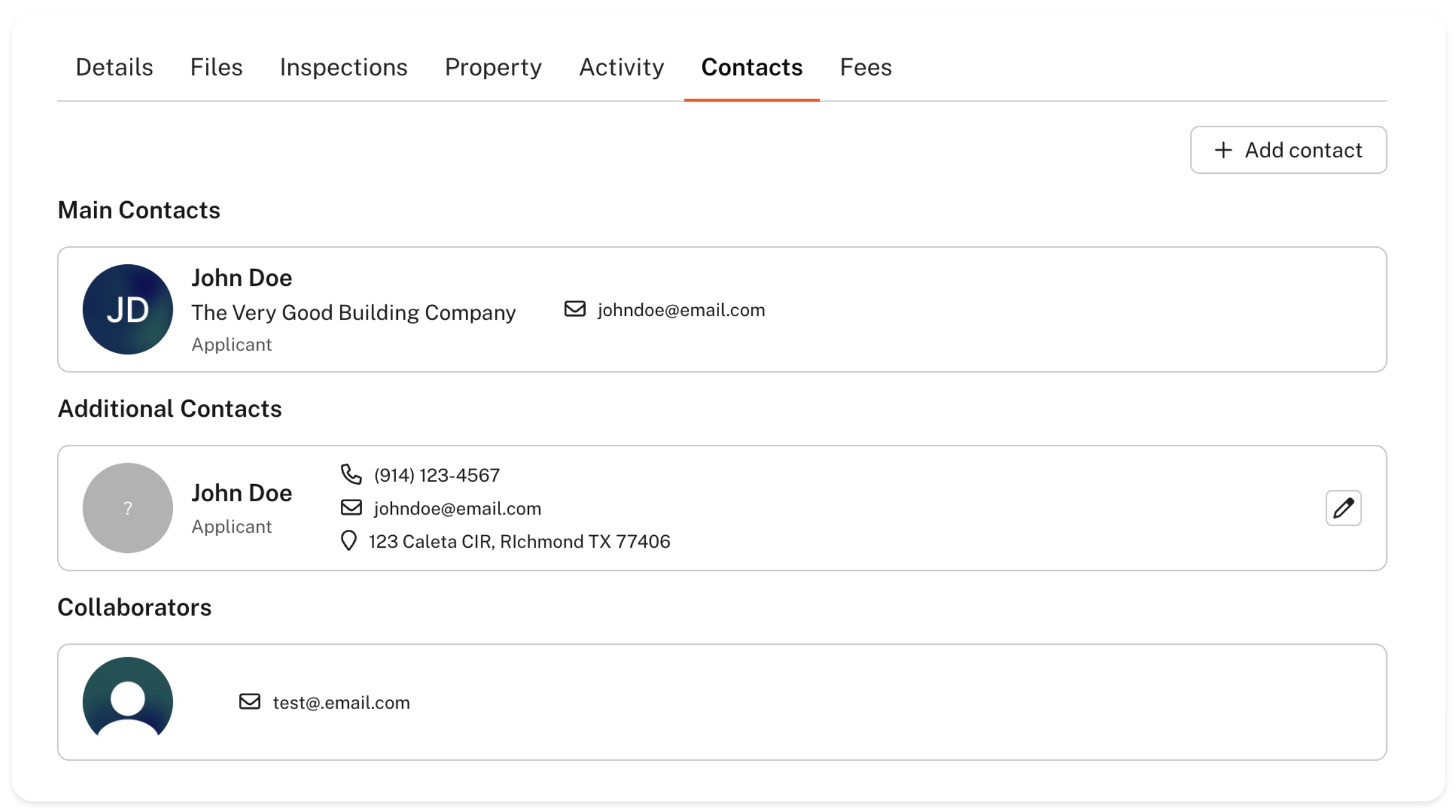 The Contacts tab displays all relevant contacts for the application, including the main contacts such as the applicant and assigned contractors. This page also shows any collaborators assigned to the project.