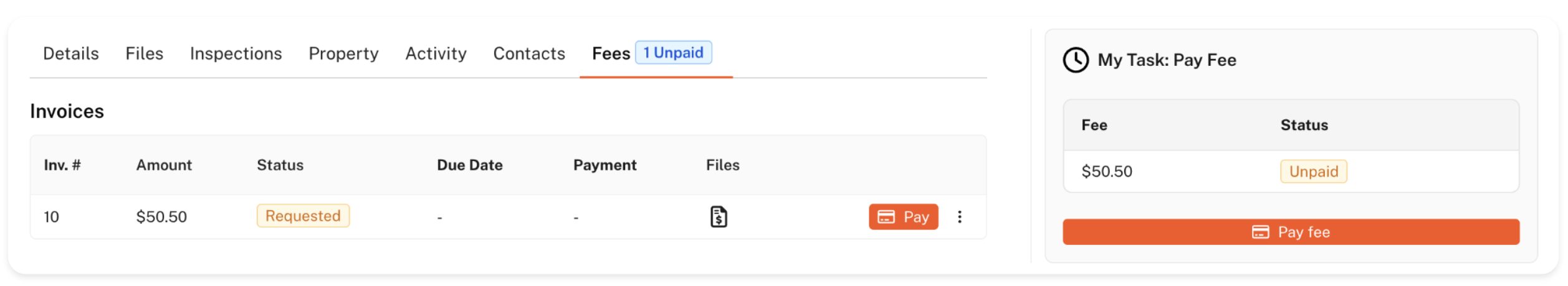 If you need to review the invoice before proceeding with your payment, simply click the document icon under the 'Files' column on this page. This will open a copy of the invoice issued by jurisdiction staff. Once you're ready to pay, click the orange 'Pay' button to initiate the payment!