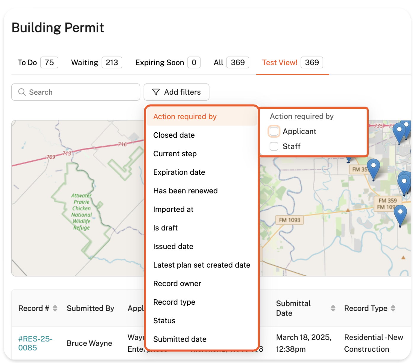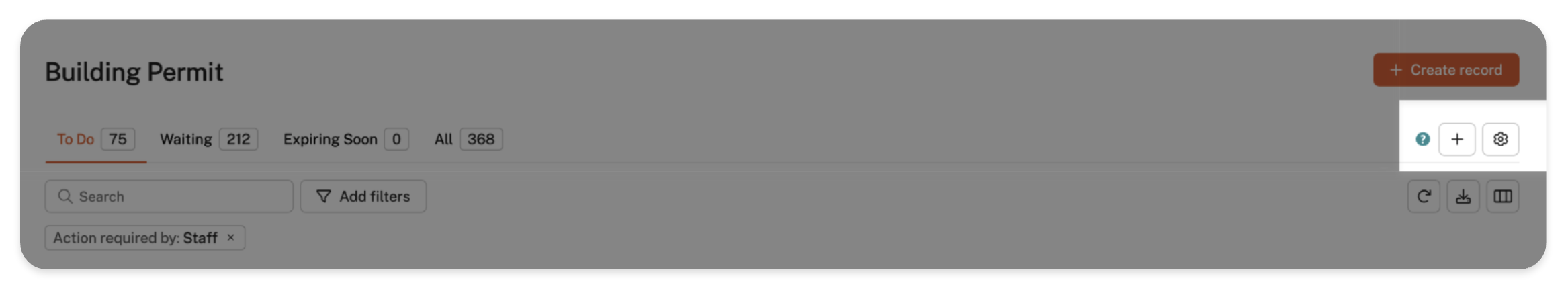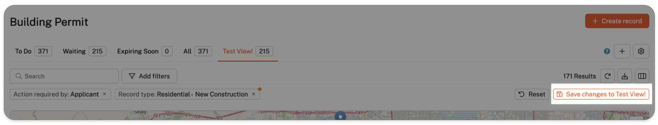 From any of your module sections (Permits, Plan Reviews, Inspections, etc.), you should see a couple of options on the right side: 'Add View' and 'Edit Saved View'.