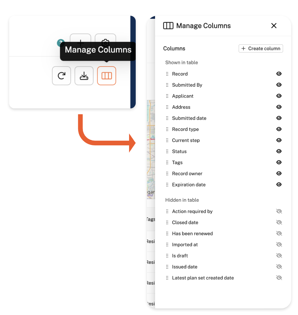You can rearrange columns by dragging them using the handles on the left side, and you can hide or reveal them by pressing the eye icon next to each one. The "eye" icon allows you to quickly toggle visibility for individual columns, making it an efficient tool for adjusting displayed information.