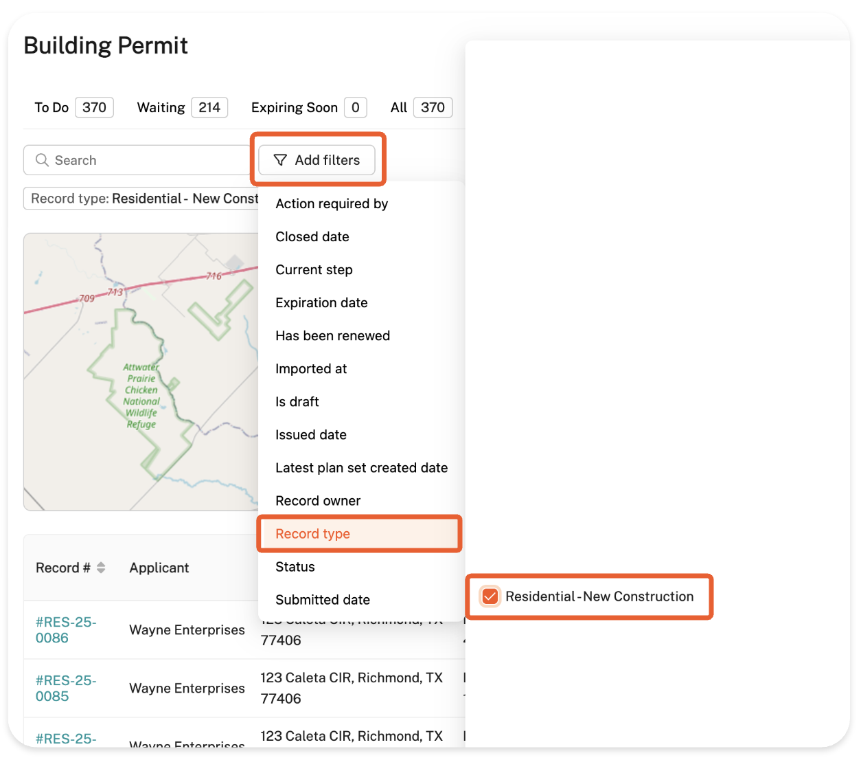 Lastly, we want to ensure that only 'Residential - New Addition' applications are displayed. To do this, we simply need to filter the results by Record Type using the 'Add Filters' button: