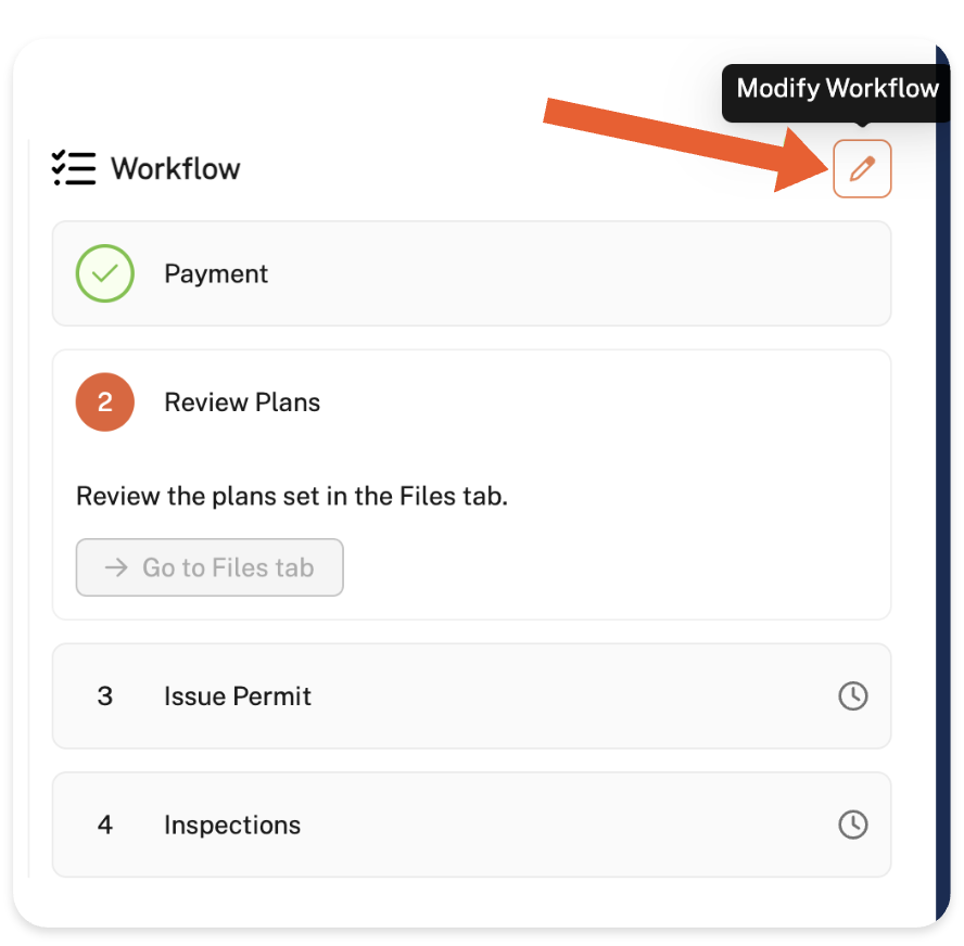 Worth noting you cannot edit, rearrange, or delete workflow steps that have already been completed. In the event of mistakenly completing/skipping a step, you can address it by adding a new, identical step, make it the current step and resume your work from there. For instance, if the 'Review Plans' step was mistakenly completed, you can add a new 'Review Plans' step above the current workflow step and activate it.