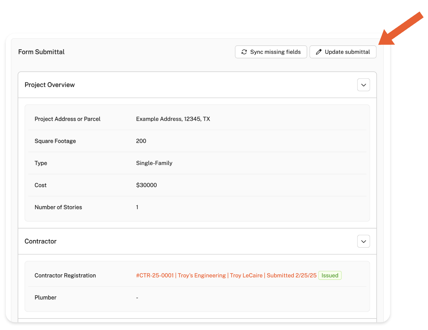 From the 'Overview' section of the application page, scroll down to the Form Submittal section and click the 'Update Submittal' button to edit the form's information. In this section, you'll find the Address/Parcel field that the applicant entered. Update the address as needed, then save the changes to update the address in the application.