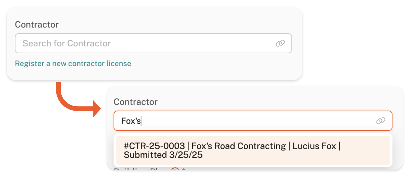 While filling out an application, you can easily search for registered contractors by typing their trade name or contractor registration number into the 'Contractor' field and pressing Enter to view matching results.