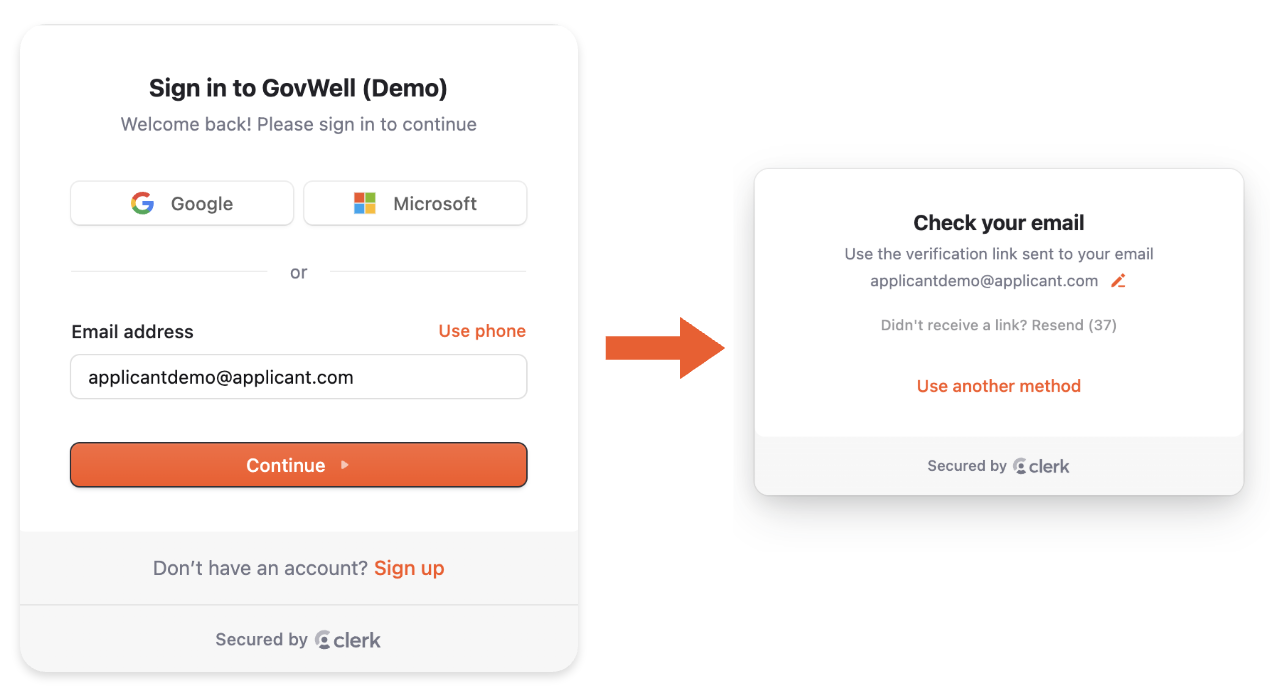 Typically, email verification is the method most users use to log in. After setting up your account (for a full guide on how to do this, please refer to our 'How to Create Your GovWell Account' guide here), you can easily log in by entering your email address in the 'Email Address' field and pressing 'Continue.'