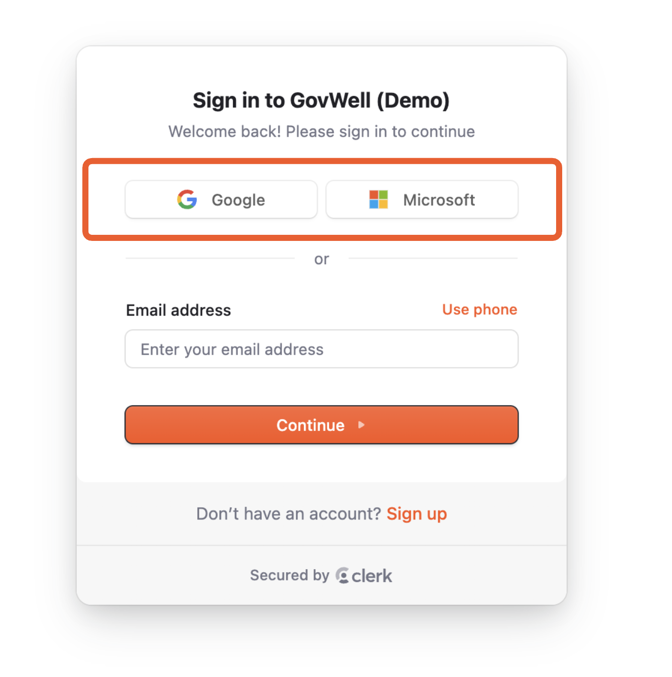 If you prefer, you can also sign in using Single Sign-On (SSO) by clicking the Google or Microsoft buttons on the sign-in page. You can then use your Google or Microsoft account linked to your GovWell account to log in!