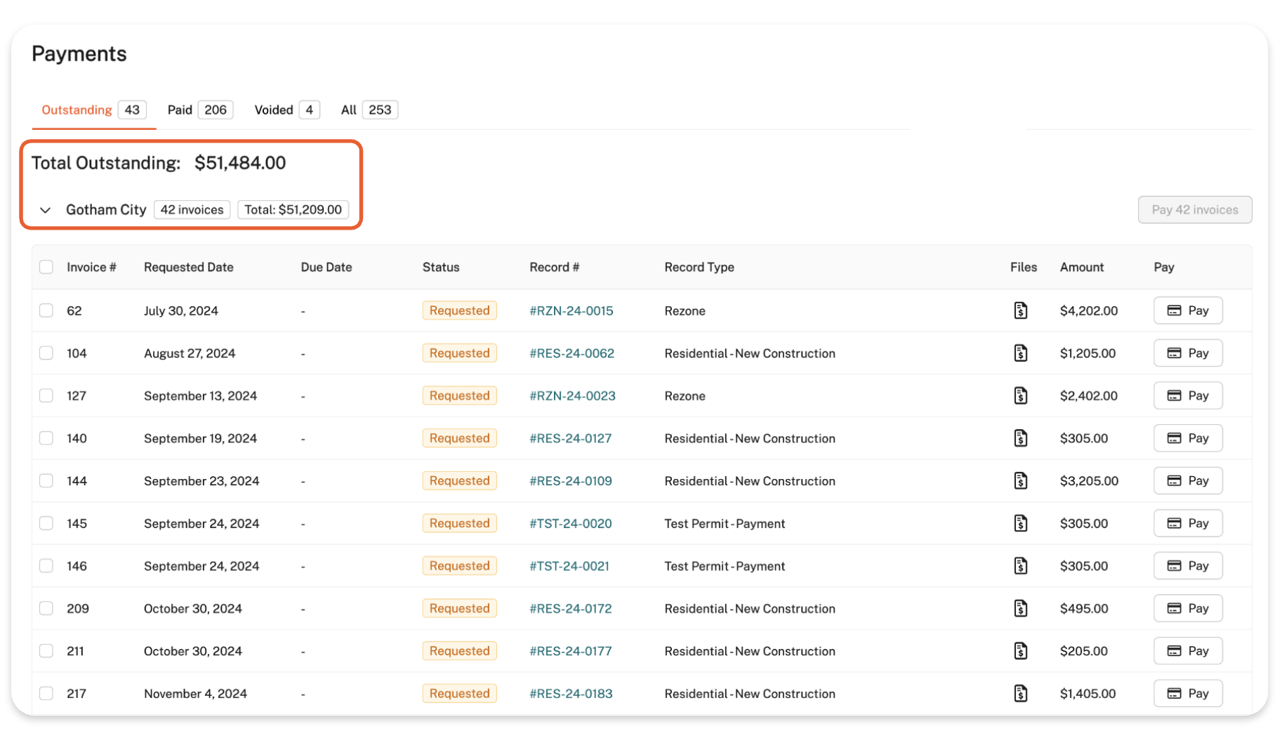 Please note that for jurisdictions not partnered with our integrated payment provider, Finix, the 'Pay' button will redirect you to the 'Fees' tab of the respective record, where you can complete the payment.