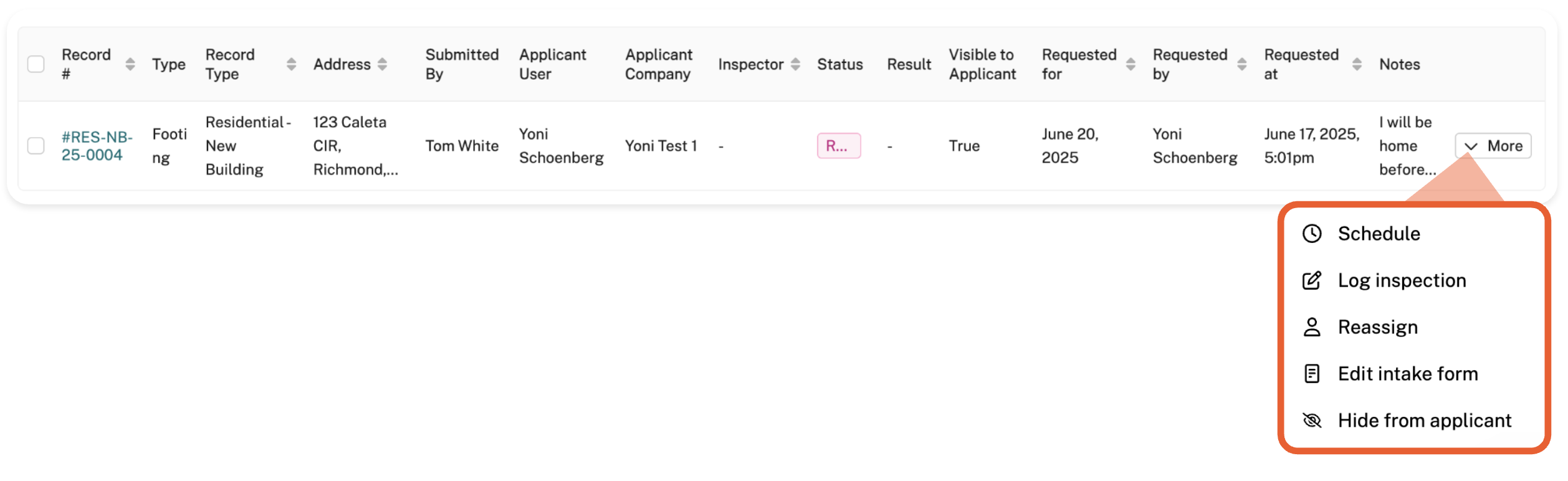 Within the results, you can either click the More dropdown to reveal the option to schedule an inspection, or you can access the application directly by clicking the application number. This will take you to the Inspections tab of that record.