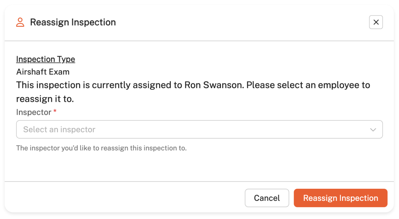 Select an inspector to assign to the inspection. When you choose this option, a small window will appear prompting you to select an inspector. Click the dropdown menu, choose the appropriate inspector, and confirm your selection by clicking Reassign Inspection.