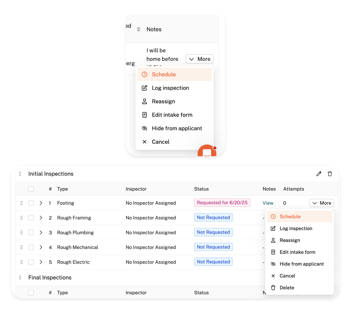 Next to the requested inspection, you'll find a More dropdown button - click on it and select Schedule to open the scheduling menu.