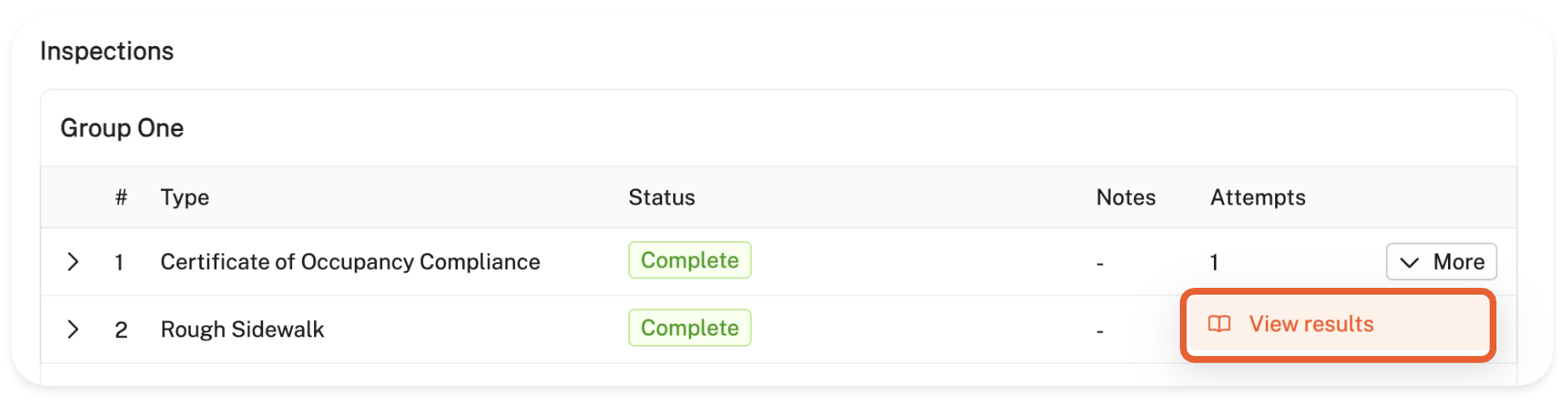 You can check the results of your logged inspections by clicking the More dropdown menu on the right side of the table view and selecting View Results.