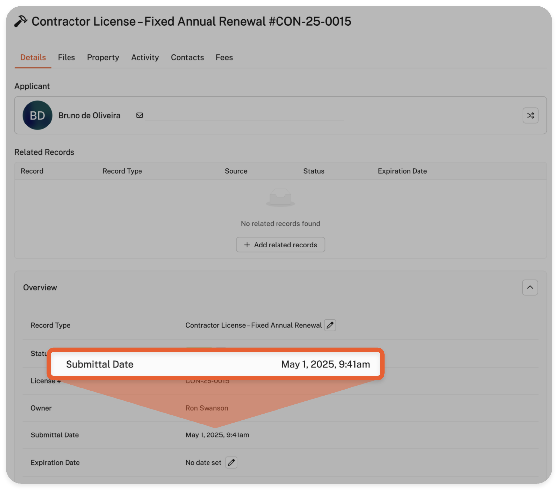 In some jurisdictions, you may also need to track additional expiration dates, such as those for licenses and insurance. This information is typically labeled and displayed in a designated section on the 'Details' page of your records.
