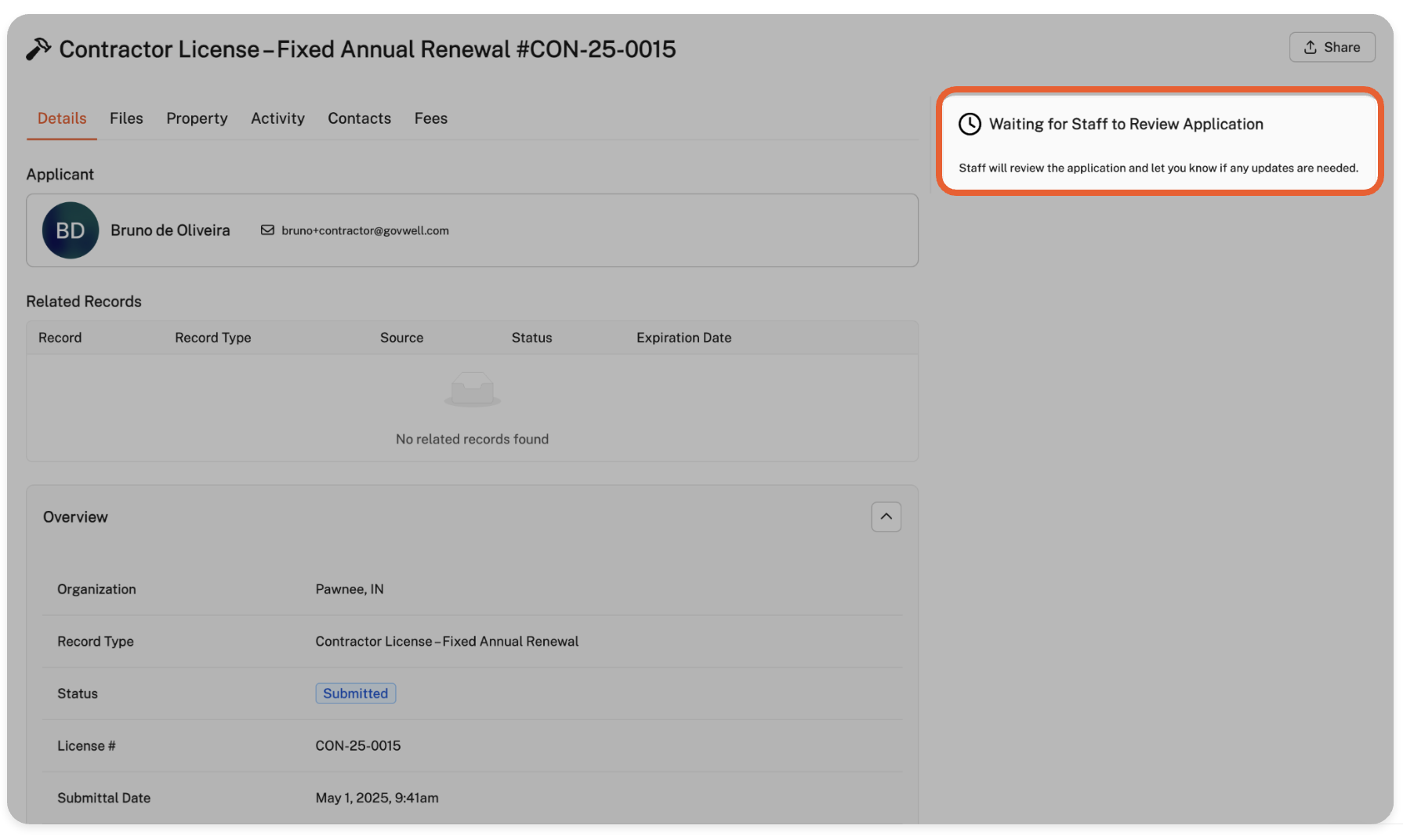 Every contractor registration has an expiration date - whether it's the registration itself, your policy, or your insurance that needs to be renewed. GovWell helps your jurisdiction track each date and notifies the relevant parties when it's time to begin the renewal process. In your registration page, you can find the expiration date next to the 'Submittal Date' field.