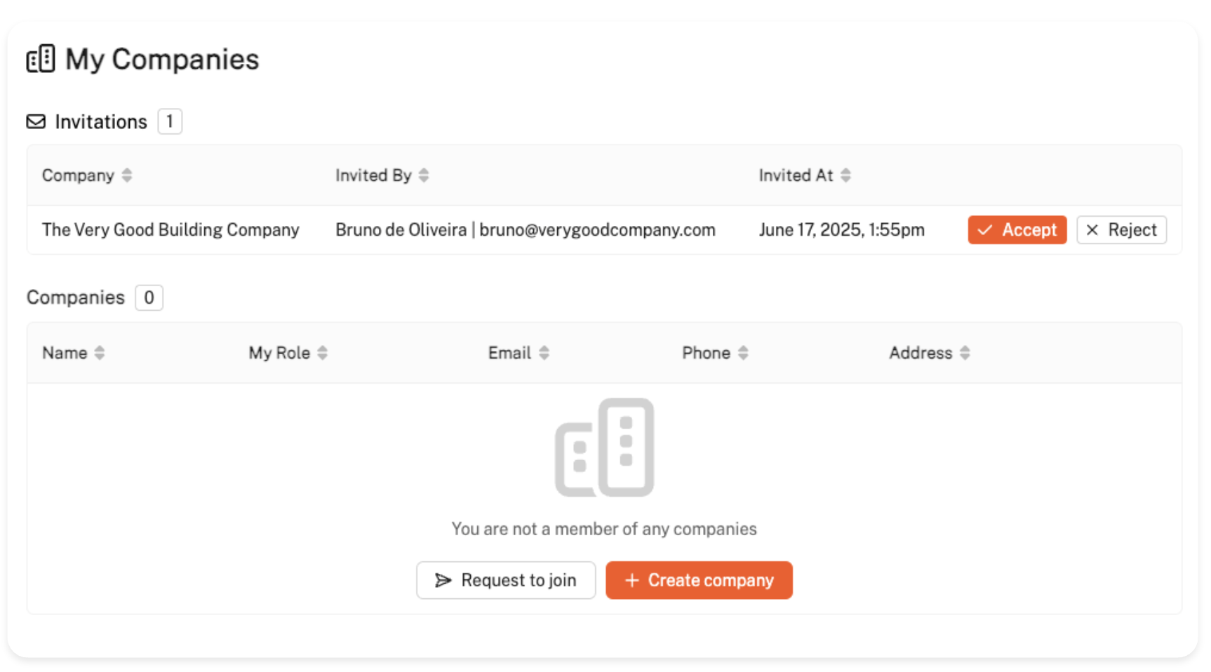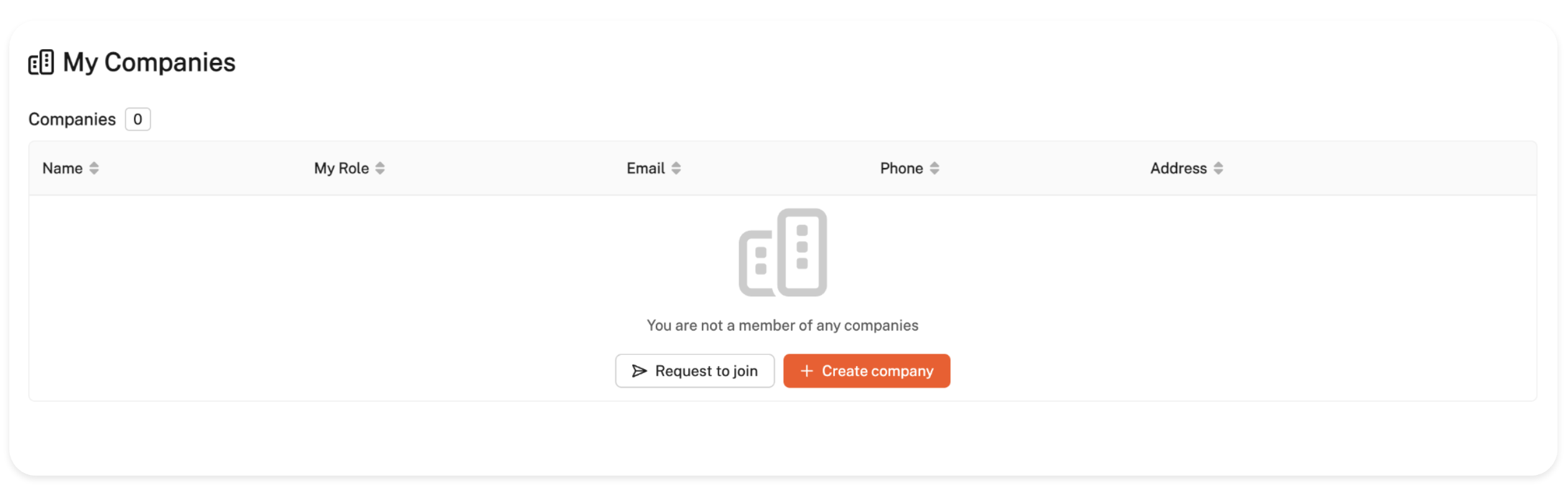 This page is your My Companies overview. If you’re not part of any companies yet, you’ll have the option to either request to join one or create your own. You can also belong to multiple companies simultaneously, each with its own unique profile and permissions.