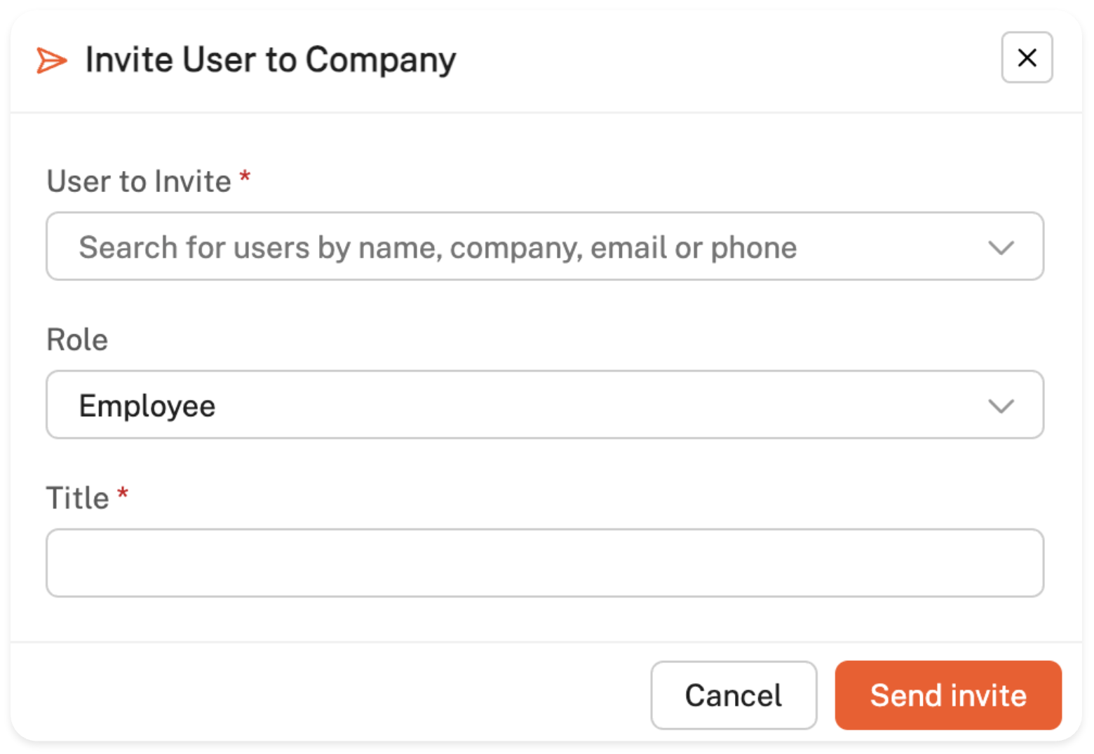 Role: select whether the user you're inviting will be an Admin or an Employee in your company. Employees can only access all the records associated with the company. Admins can manage the company details and manage user memberships.