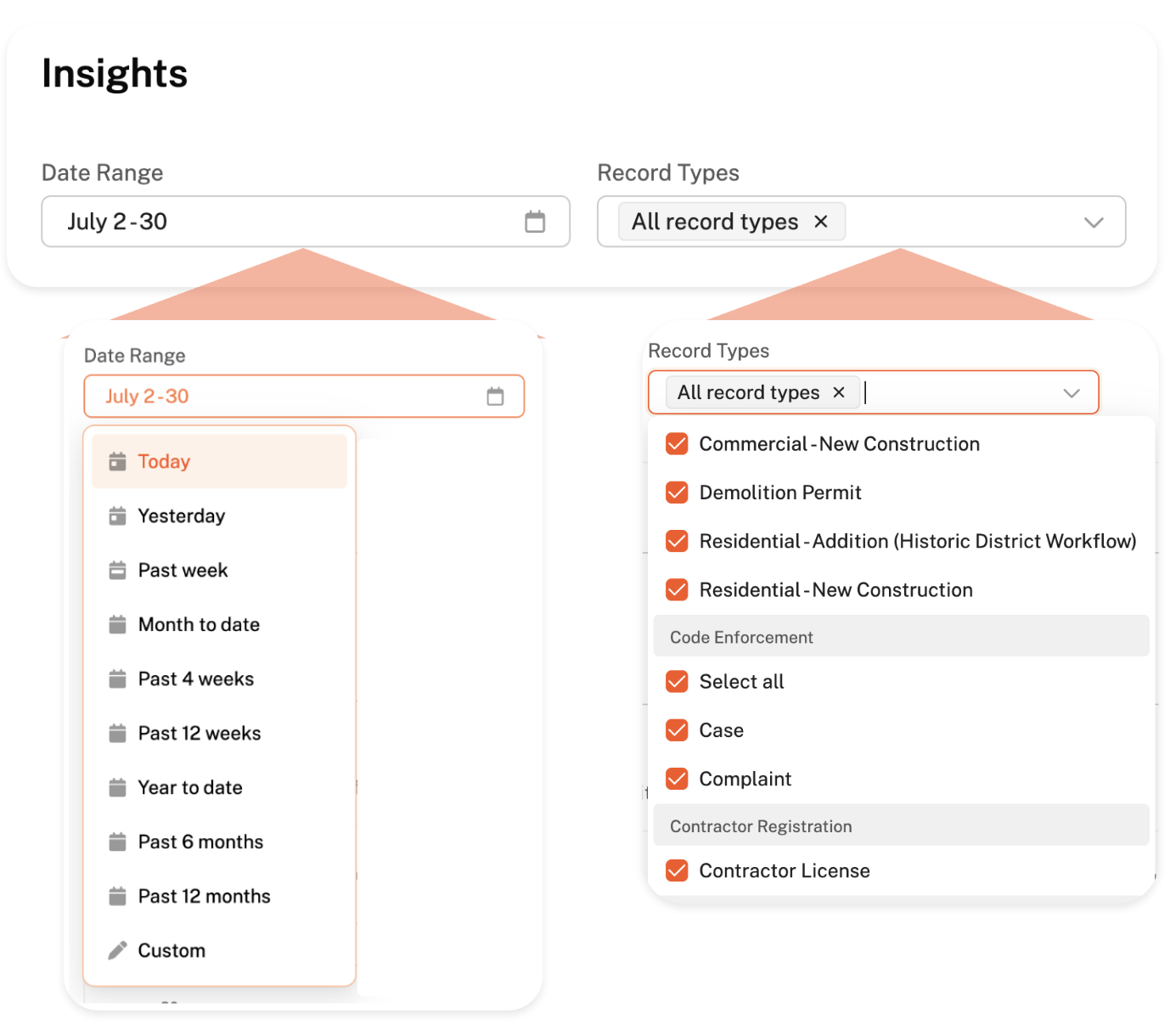 The Insights page is a helpful compilation of stats about the work you are able to get done with GovWell! In this page, you can visualize data about records and workflows, allowing you instantly spot trends in submission times, permit types, and workflow speed.
