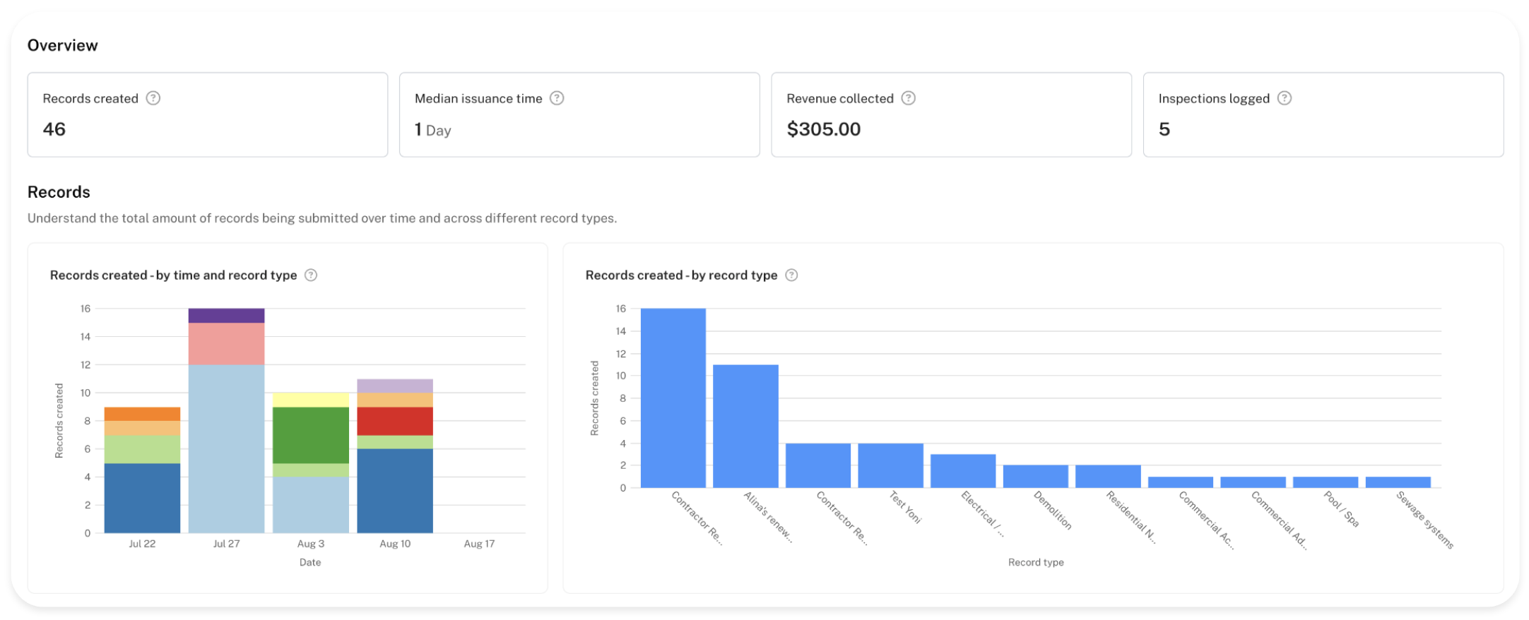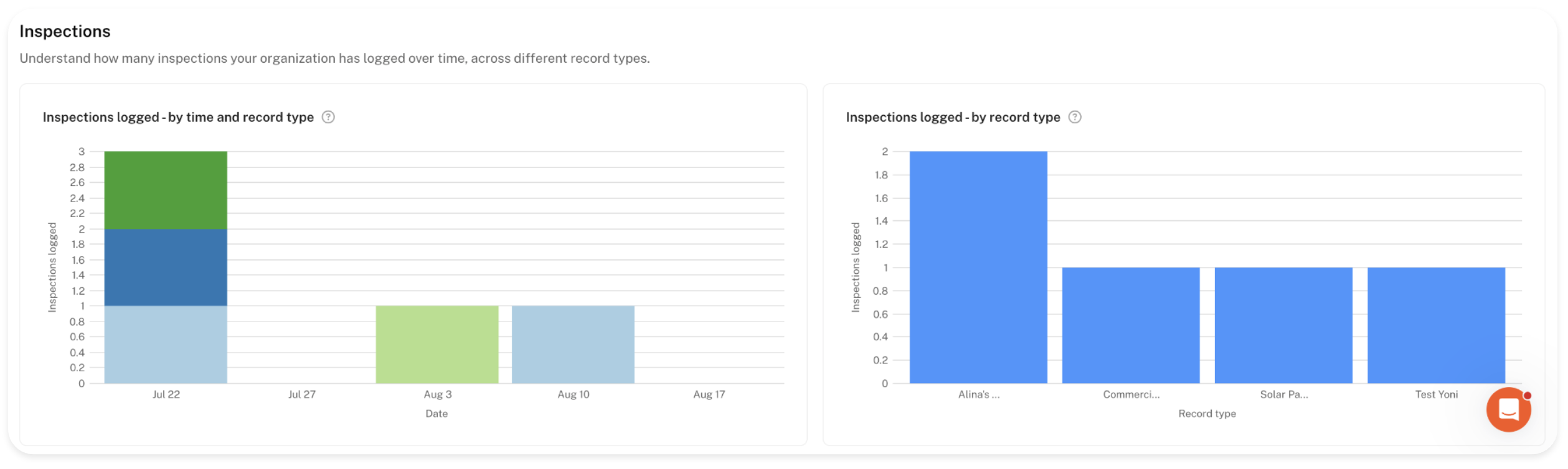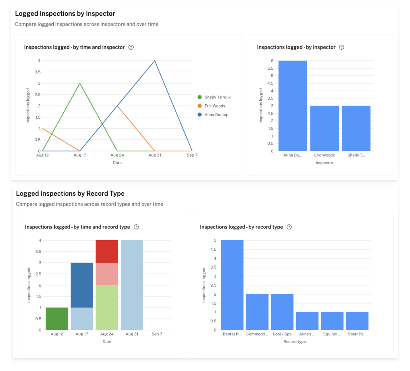 In here you'll find a generalized breakdown of how many inspections your organization has logged over time, across different record types.