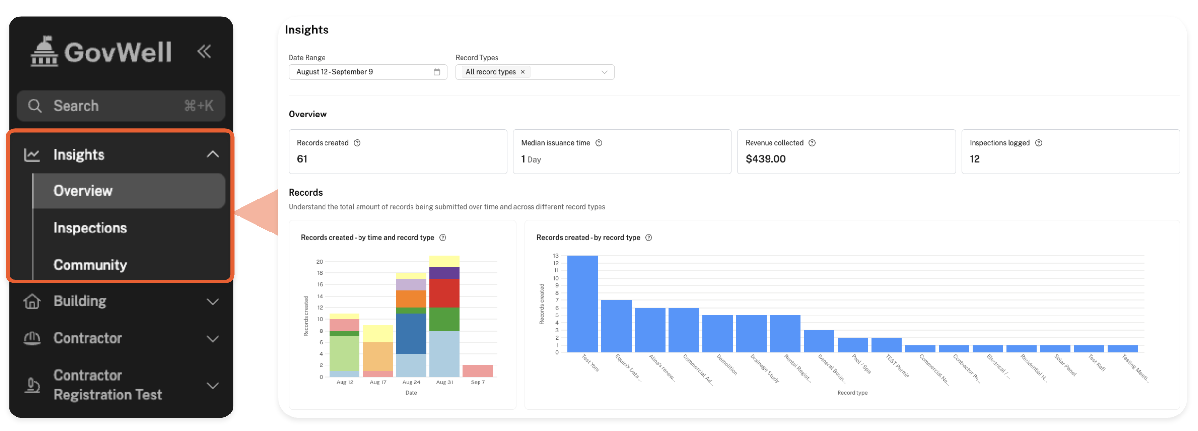 At the top of the options in your GovWell sidebar you should find an 'Insights' button. Expand it to reveal the currently available views: Overview, Inspections and Community.