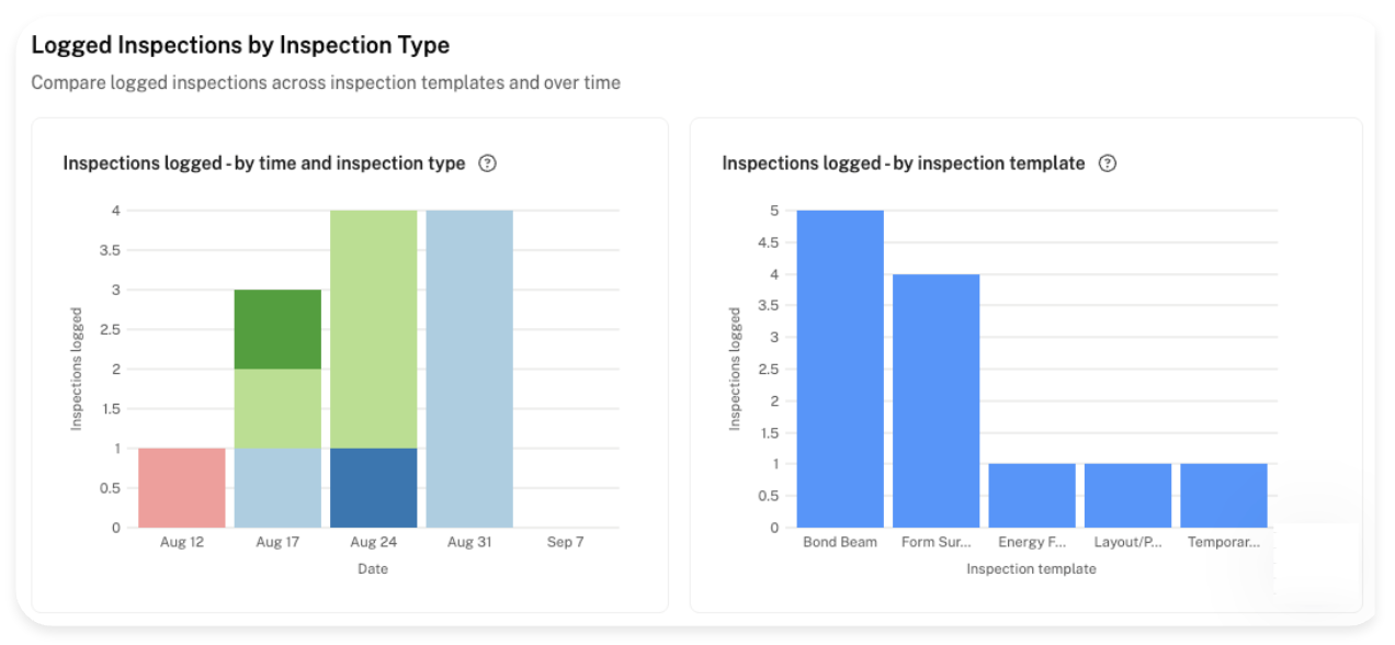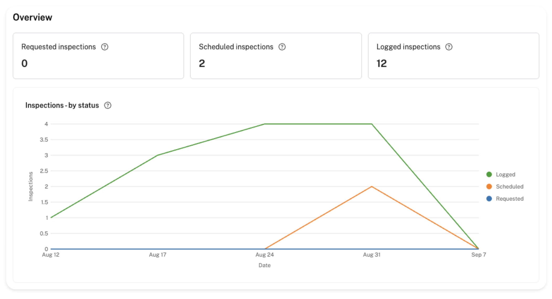 An overview of your inspection stats, breaking down how many inspections were logged/scheduled/requested within the selected date range.