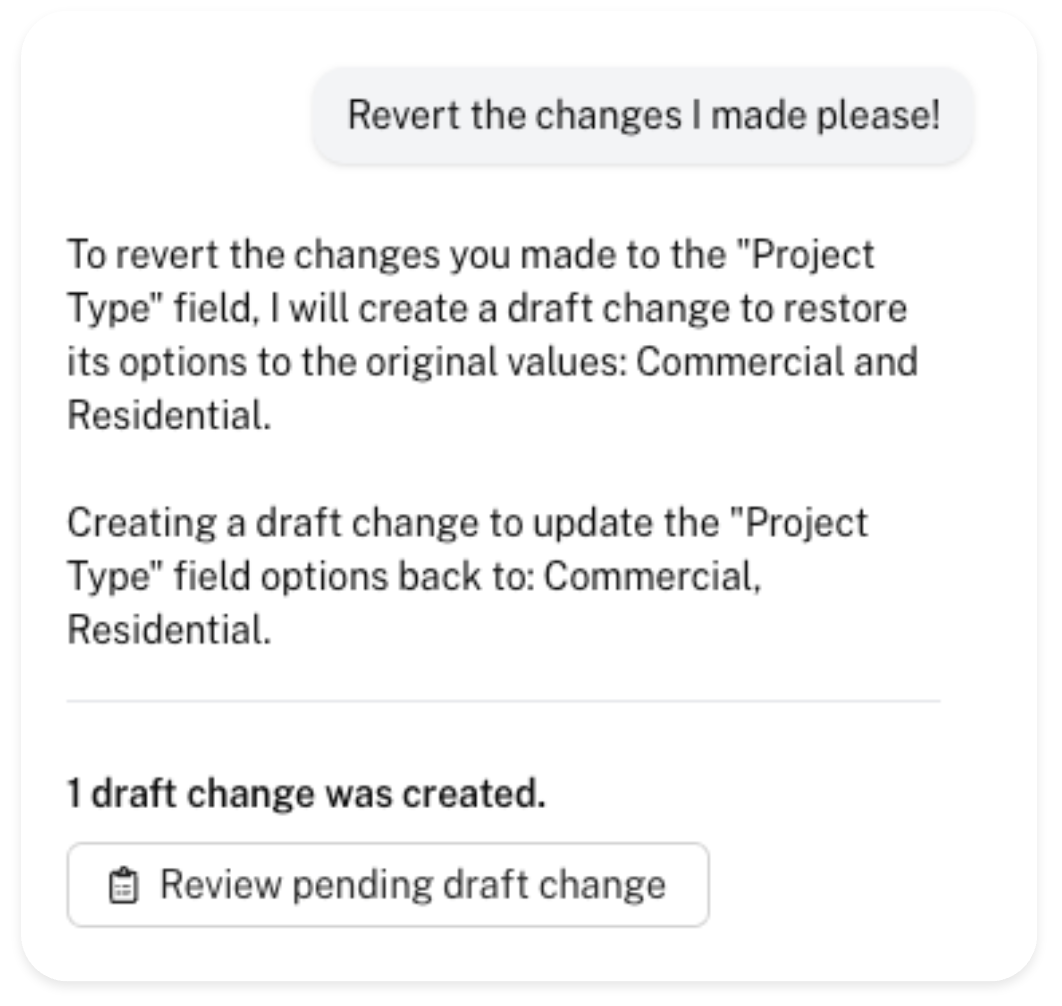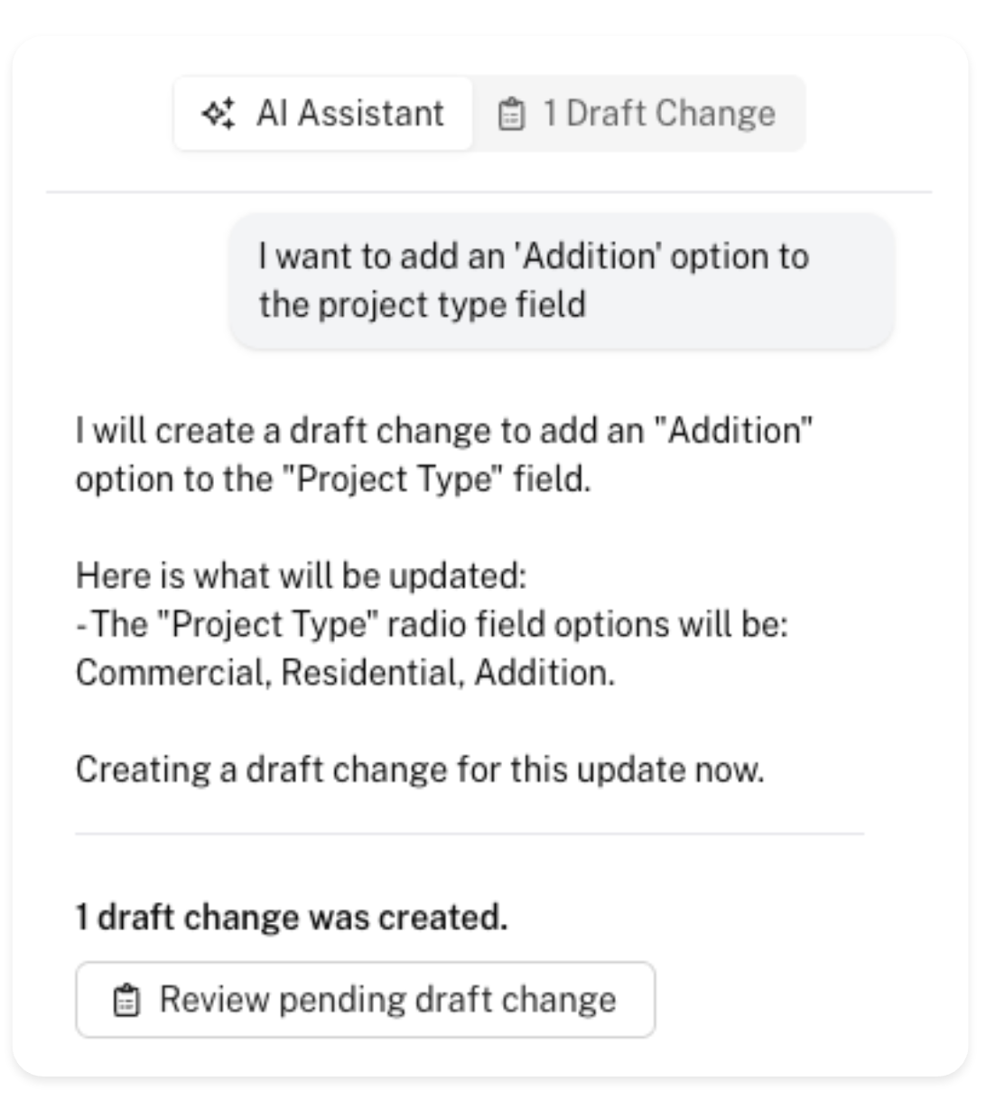 The assistant will analyze the instruction and return a proposed action. Any proposed actions will be saved as a draft for review - in this case, the assistant has proposed the action to add the 'Addition' option to the 'Project Type' field, which will result in the field having three options instead of two.