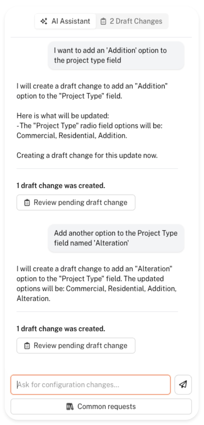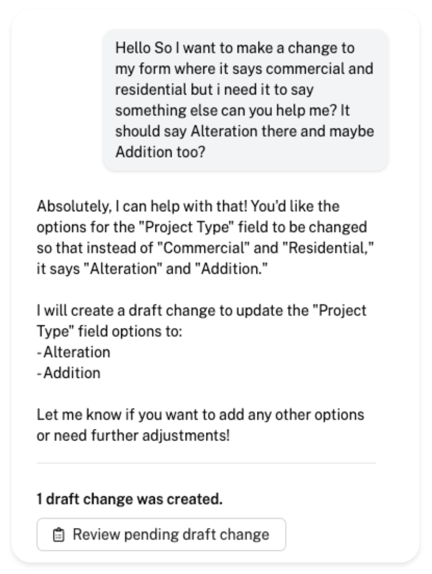 Using the AI Configuration Assistant is incredibly easy! In the chat window, start by writing down the change you'd like to make to your application form. In this case, let's try to add an 'Addition' option in the Project Type radio field.