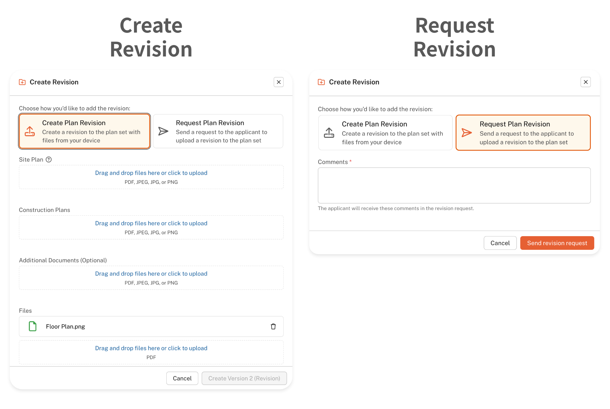 Create Plan Revision – Upload the revised files directly to the plan set. Applicant input is not required; simply upload the files to the revision and route it for plan review.