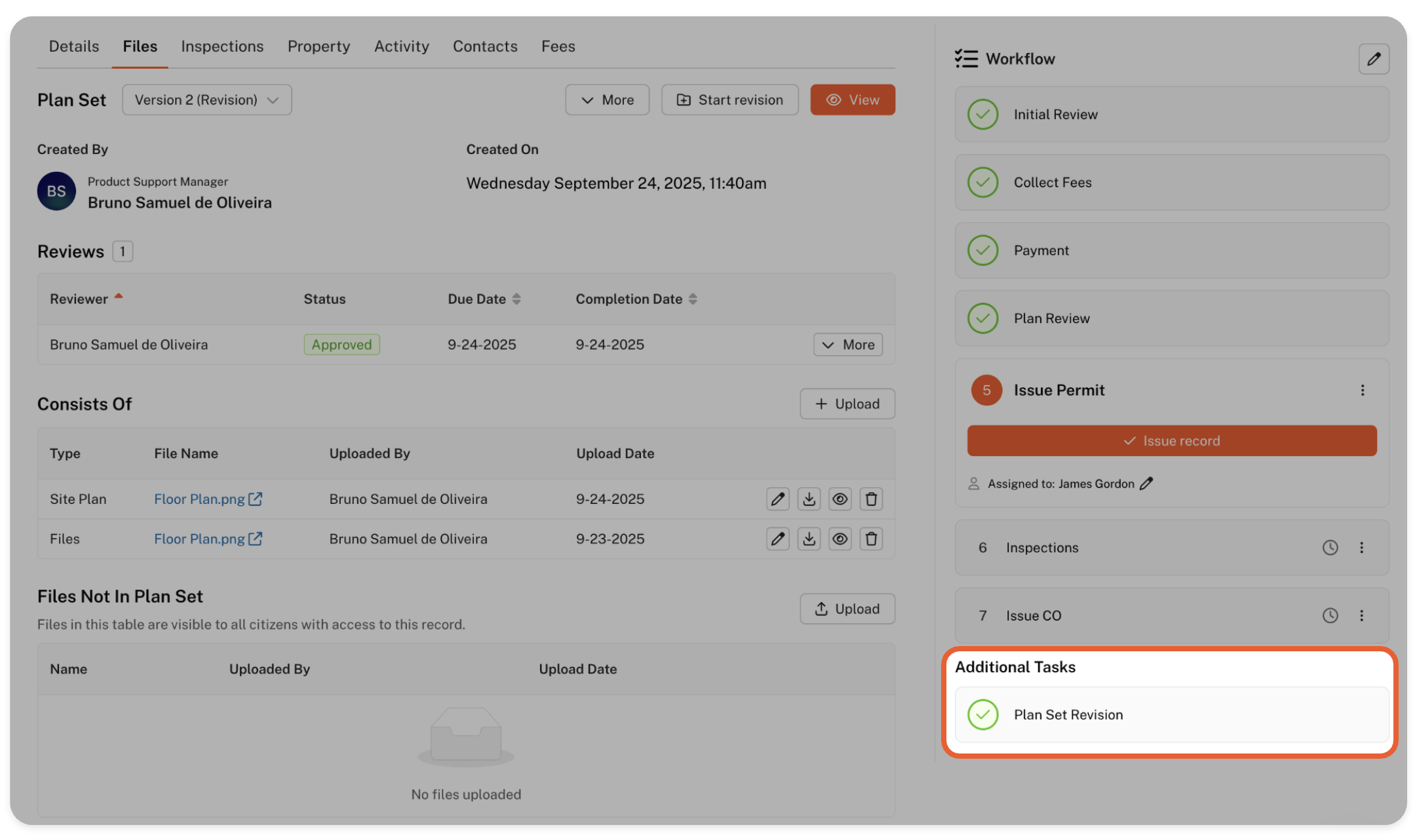 Let’s take the above case as an example: both reviews by James and Lucius were completed, but a revision is suddenly required due to a regulation change that now affects the plans.