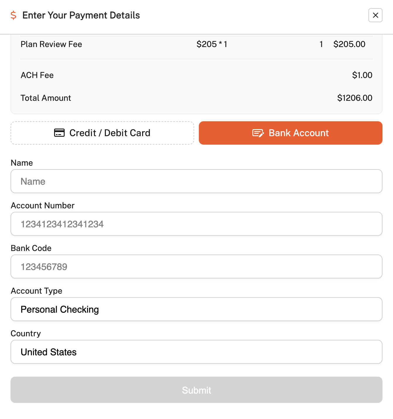 A new window will pop up, displaying a breakdown of the fees and a form to complete your payment. In this window, you will have two payment options to choose from: Credit/Debit Card or Bank Transfer (via ACH).