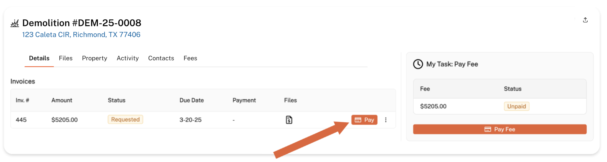 Each time your jurisdiction issues an invoice, you can initiate a payment by clicking the orange 'Pay Button' next to the relevant invoice.