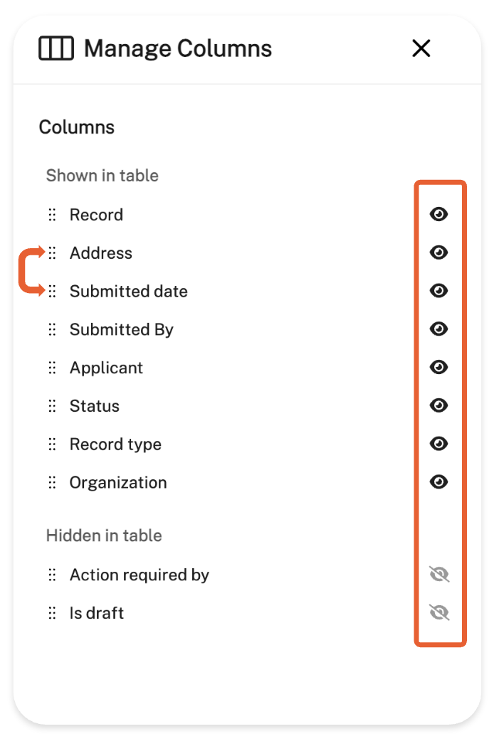 Use this feature to manage which columns you want to see and their order! By clicking the 'Manage Columns' button, a menu will appear on the right side of your screen, allowing you to reorganize columns and hide or reveal them.