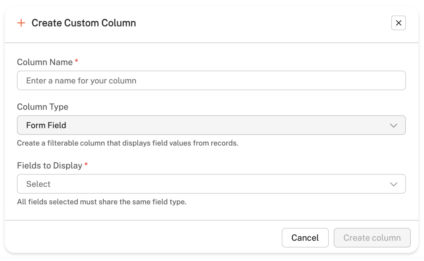 A small window will pop up, prompting you to enter a name for the new column and select which fields you want it to display. Note that the available fields for new columns will vary depending on the module.
