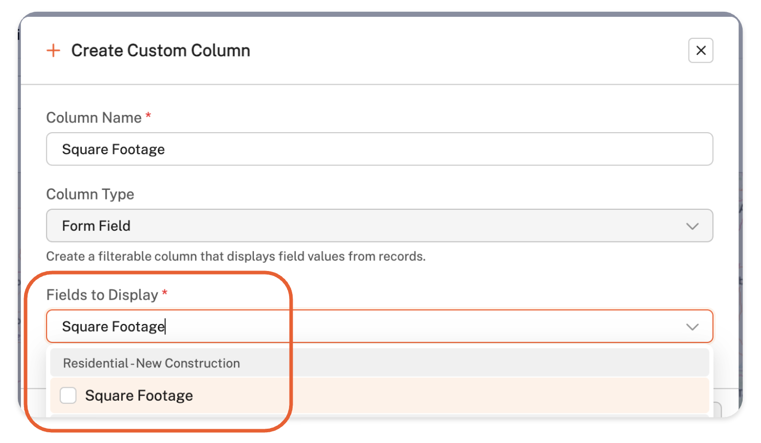 In the 'Create Custom Column' pop-up window, we'll name our new column and select the form field from which we want to pull data. In this case, we’ll choose the 'Residential - New Construction ➡️ Square Footage' form field.