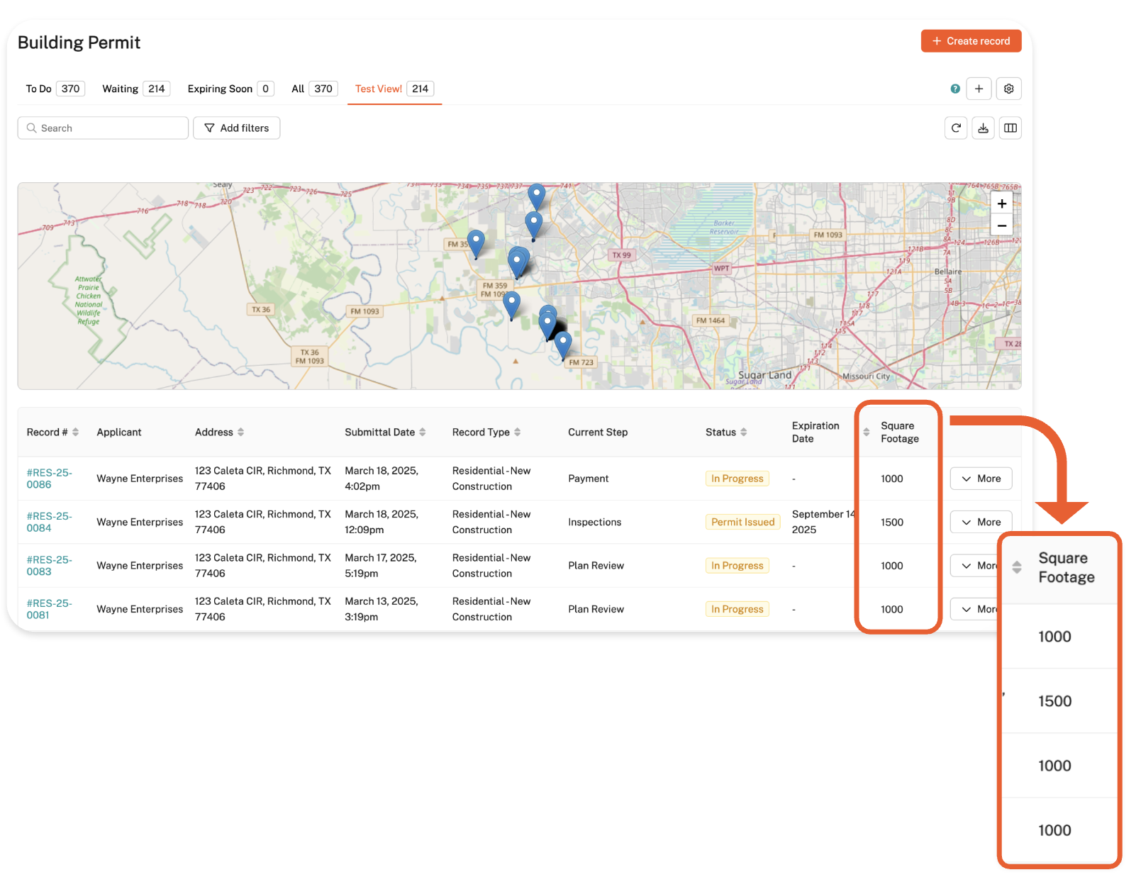 As an example, let's create a view that filters results by 'Residential - New Construction' record types and displays their respective Square Footage. We will use the view we created earlier, 'Test View!', to do this!