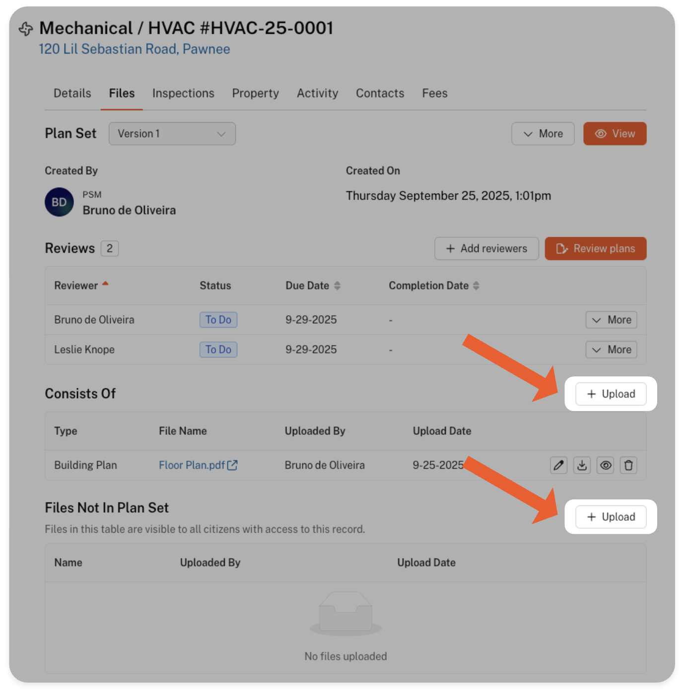 You can upload files to a record by selecting the respective 'Files' tab and clicking the 'Upload' button of the section you want to upload it to. Before uploading, be sure to confirm you're uploading your file to the correct plan set! Related ArticlesManaging your ApplicationsWhere can I find my issued Permit/Registration/License?A reviewer requested updates to my application - what do I do?I don’t have the information for a required field! What do I do?An Application Has the Wrong Record Type! How Do I Fix It?