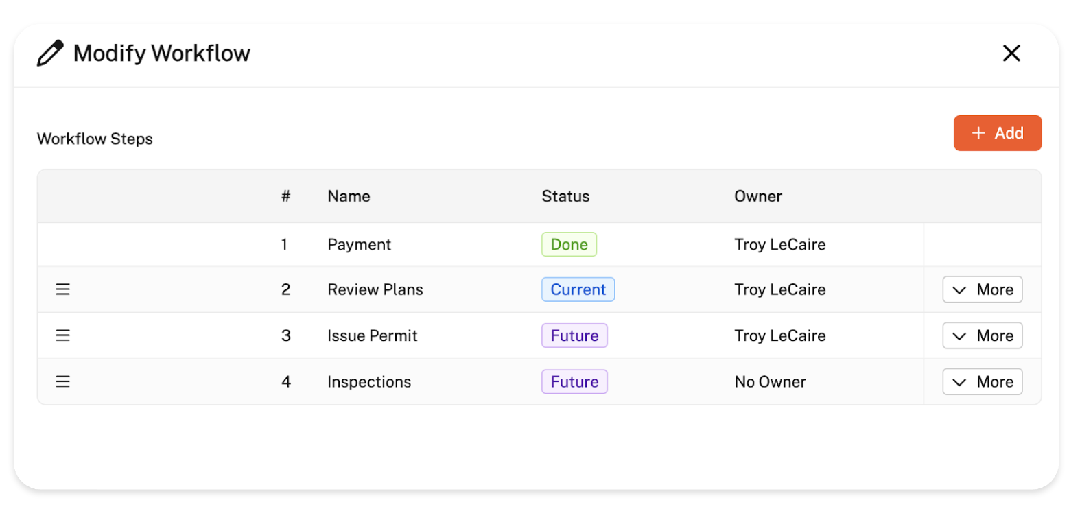Worth noting you cannot edit, rearrange, or delete workflow steps that have already been completed. In the event of mistakenly completing/skipping a step, you can address it by adding a new, identical step, make it the current step and resume your work from there. For instance, if the 'Review Plans' step was mistakenly completed, you can add a new 'Review Plans' step above the current workflow step and activate it.