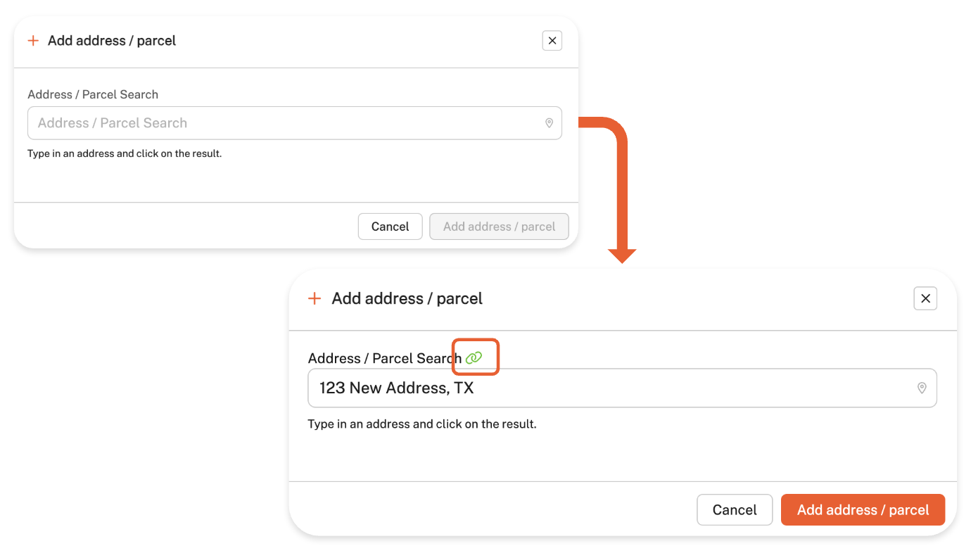 Enter the address you want to add. If the organization's Geographical Information System (GIS) is linked to GovWell, it will automatically find and match any registered addresses in the system when you search. You can confirm if an address is GIS-linked by the green link icon next to the address/parcel search field.