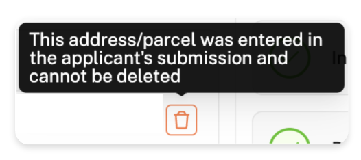 It's important to note that the original address entered by the applicant cannot be removed from the Property tab. This is indicated in the tooltip that appears when you hover your cursor over the trash can icon.