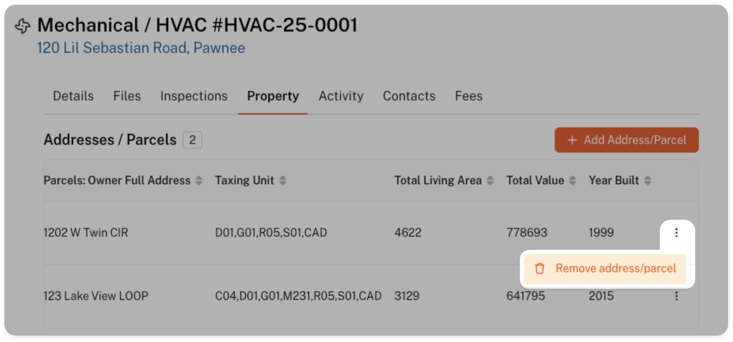 If a second address has been added to the Property tab and needs to be removed, you can easily do so by clicking the small trash can icon located at the far-right side of the Address/Parcels table. In some cases, you may need to scroll horizontally to find this icon.