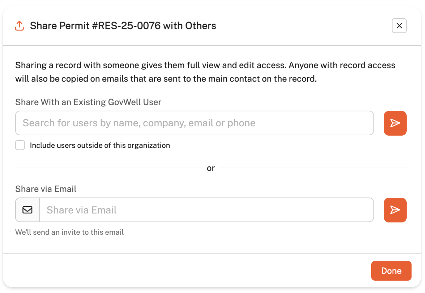 A window will appear, allowing you to select the user. If the person is already part of your organization, simply type their name under 'Share with existing GovWell user' to select them. If they are not yet part of your organization, add their email under 'Share via Email'.