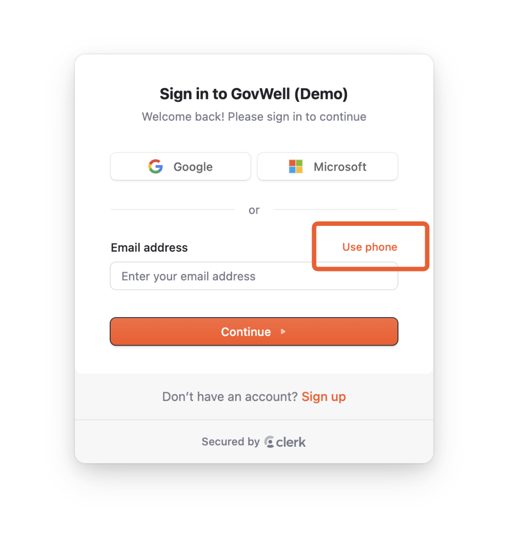 Lastly, another option to sign in is using the mobile phone number linked to your GovWell account. Simply click the 'Use phone' option to get started.