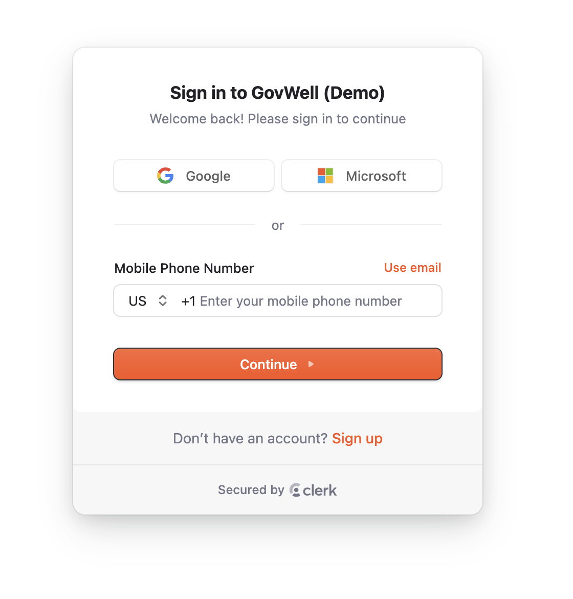 GovWell is a passwordless system, meaning you don’t need to set or remember a password to access your account! All you need is your email address or mobile phone number to set up and log in to your GovWell account.