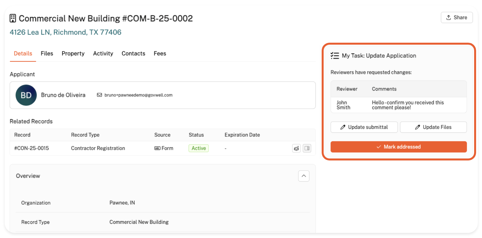 Once you've completed all updates and/or uploads, click Mark Addressed. This will notify the reviewer that your changes are complete and the application is ready for re-review.