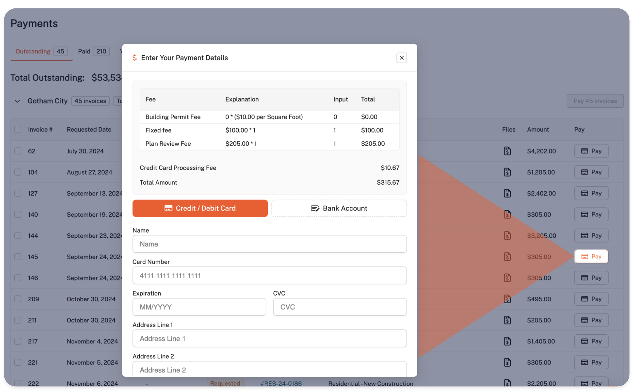 Please note that for jurisdictions not partnered with our integrated payment provider, Finix, the 'Pay' button will redirect you to the 'Fees' tab of the respective record, where you can complete the payment.