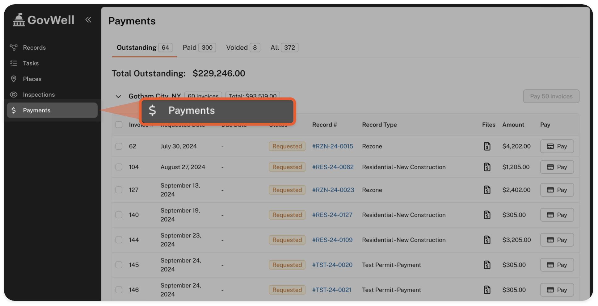 You can access your Payments Dashboard by clicking the 'Payments' button in the sidebar of your GovWell portal. Here, you'll see key information about the invoices linked to your applications.