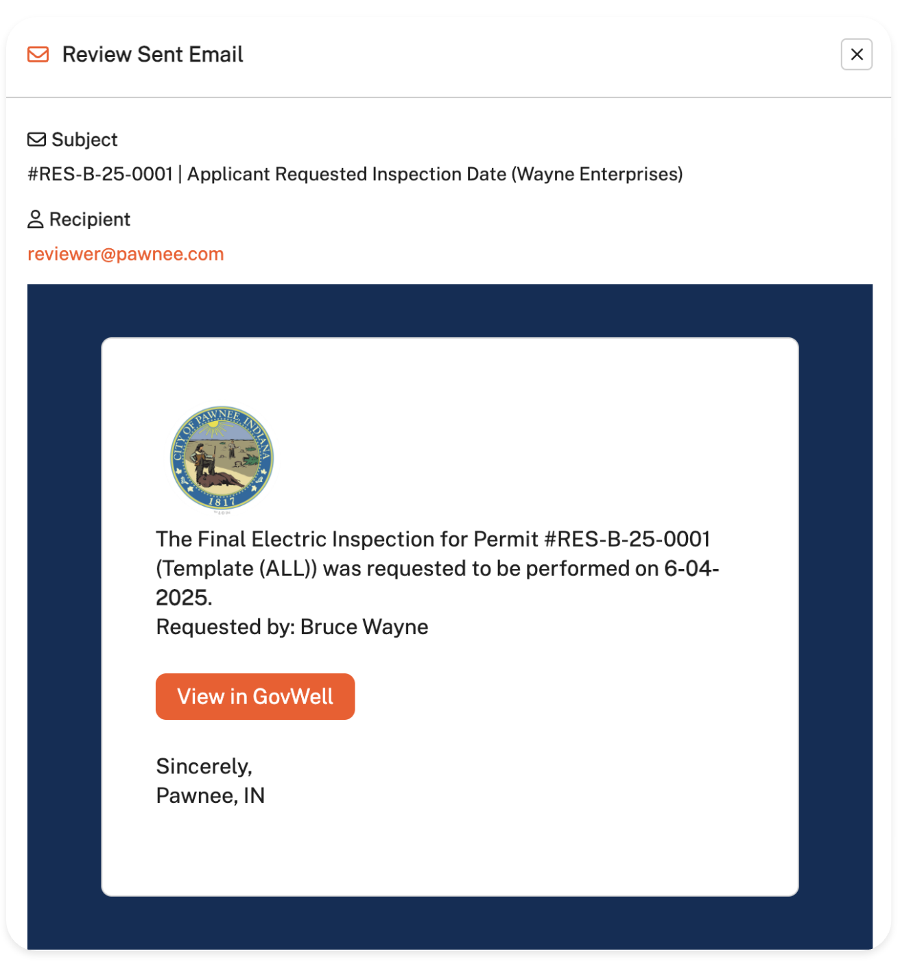 Whenever an application moves to the Inspections workflow step, the applicant is notified via email and through the platform that they can request an inspection when ready. When an applicant requests an inspection, you will receive a notification via email.