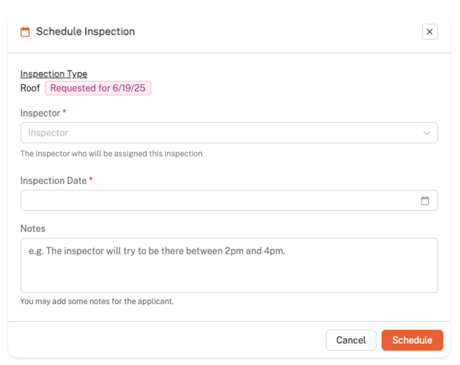 Select the inspector to assign to the task, choose the inspection date, and enter any notes visible to the applicant - such as the time of day the inspection will take place. Click Schedule to confirm the appointment!